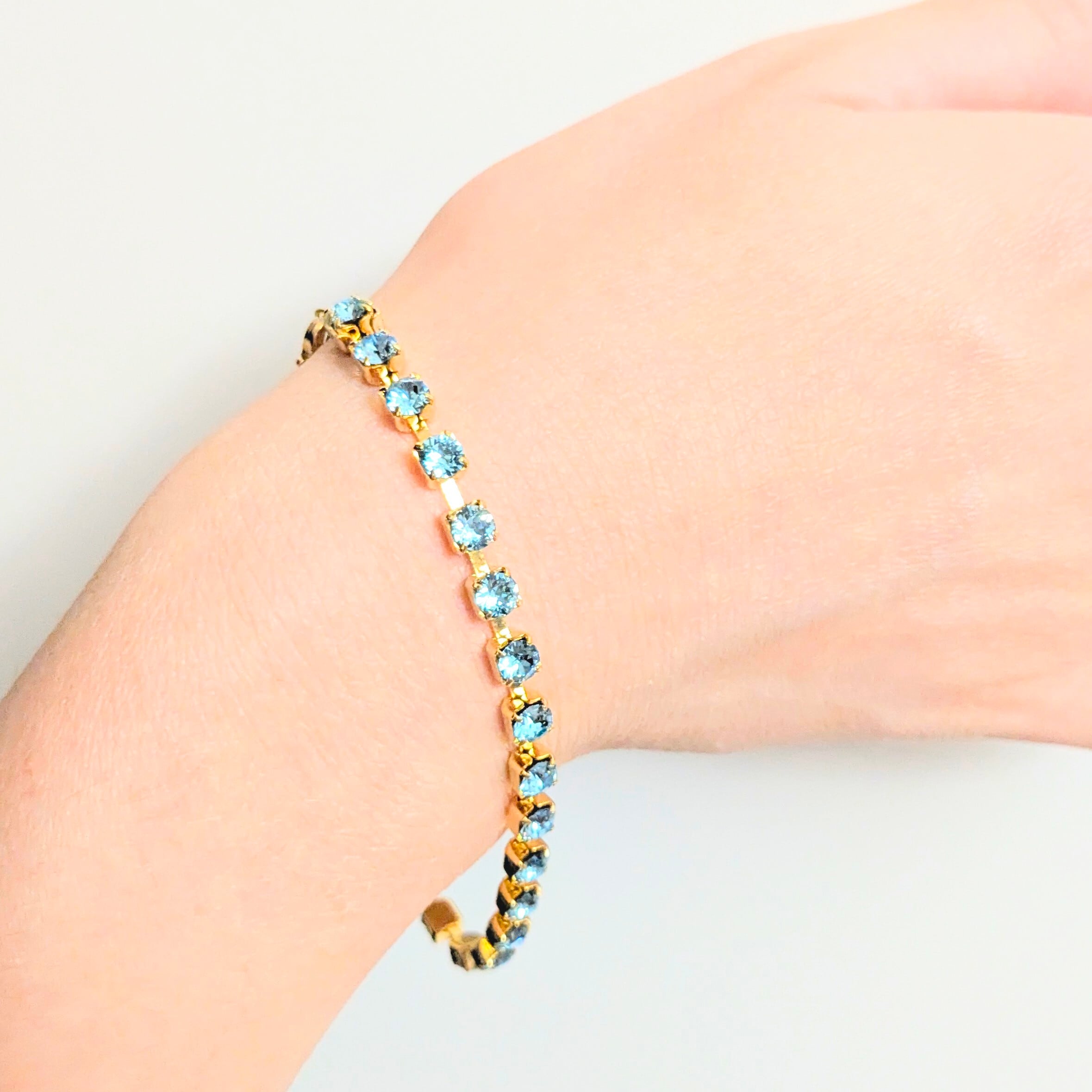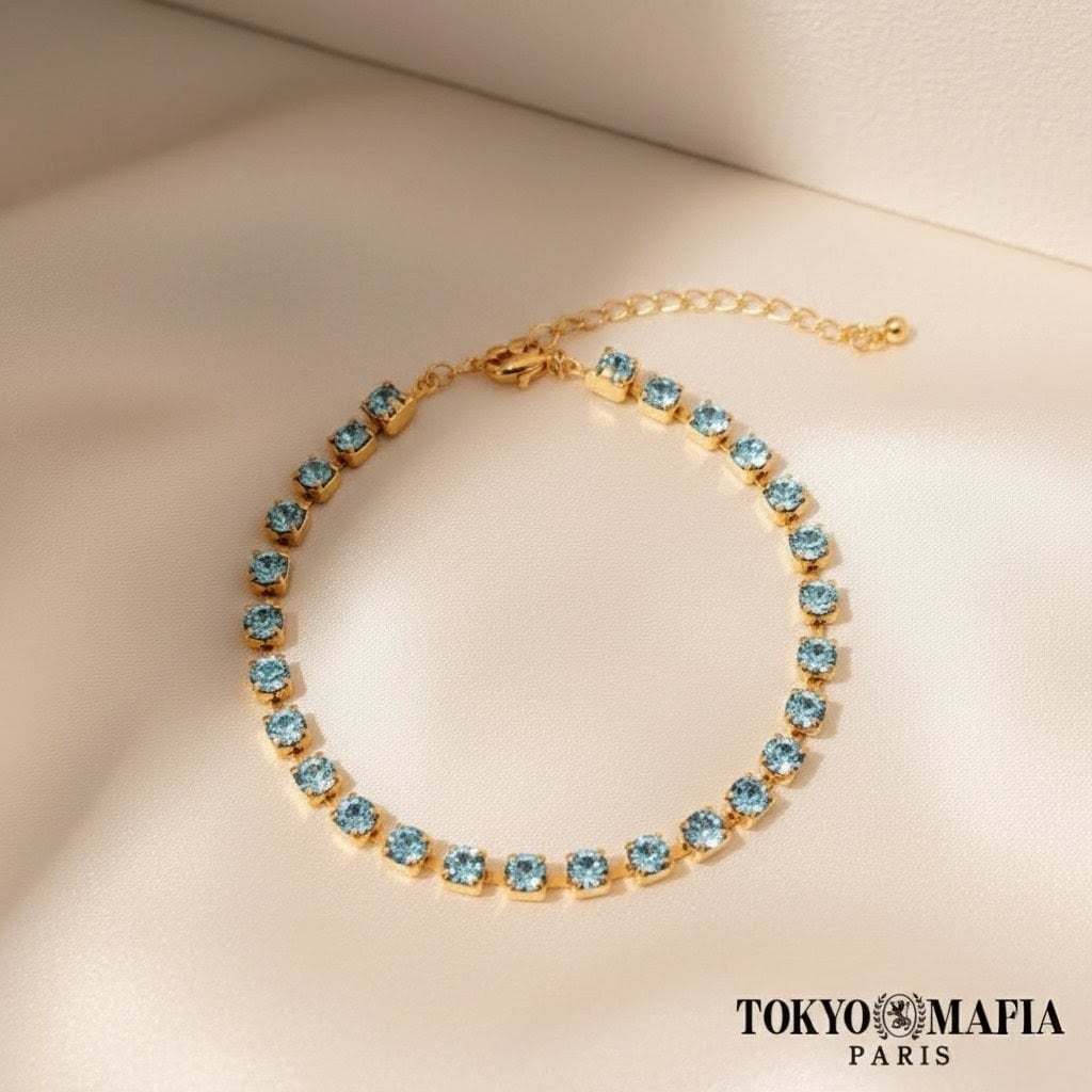 このきらめくサファイアクリスタルブレスレットは簡単に着用でき、その日のコーディネートに合わせて長さも変えられます。