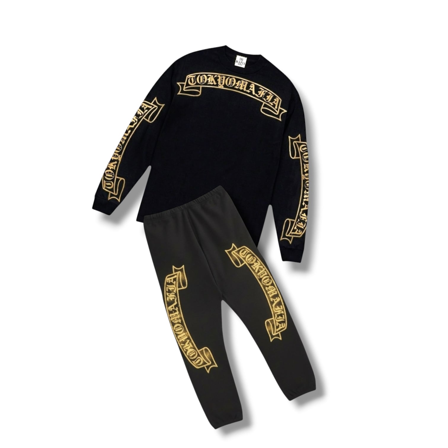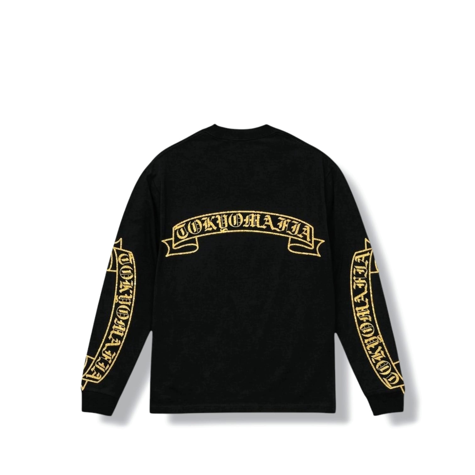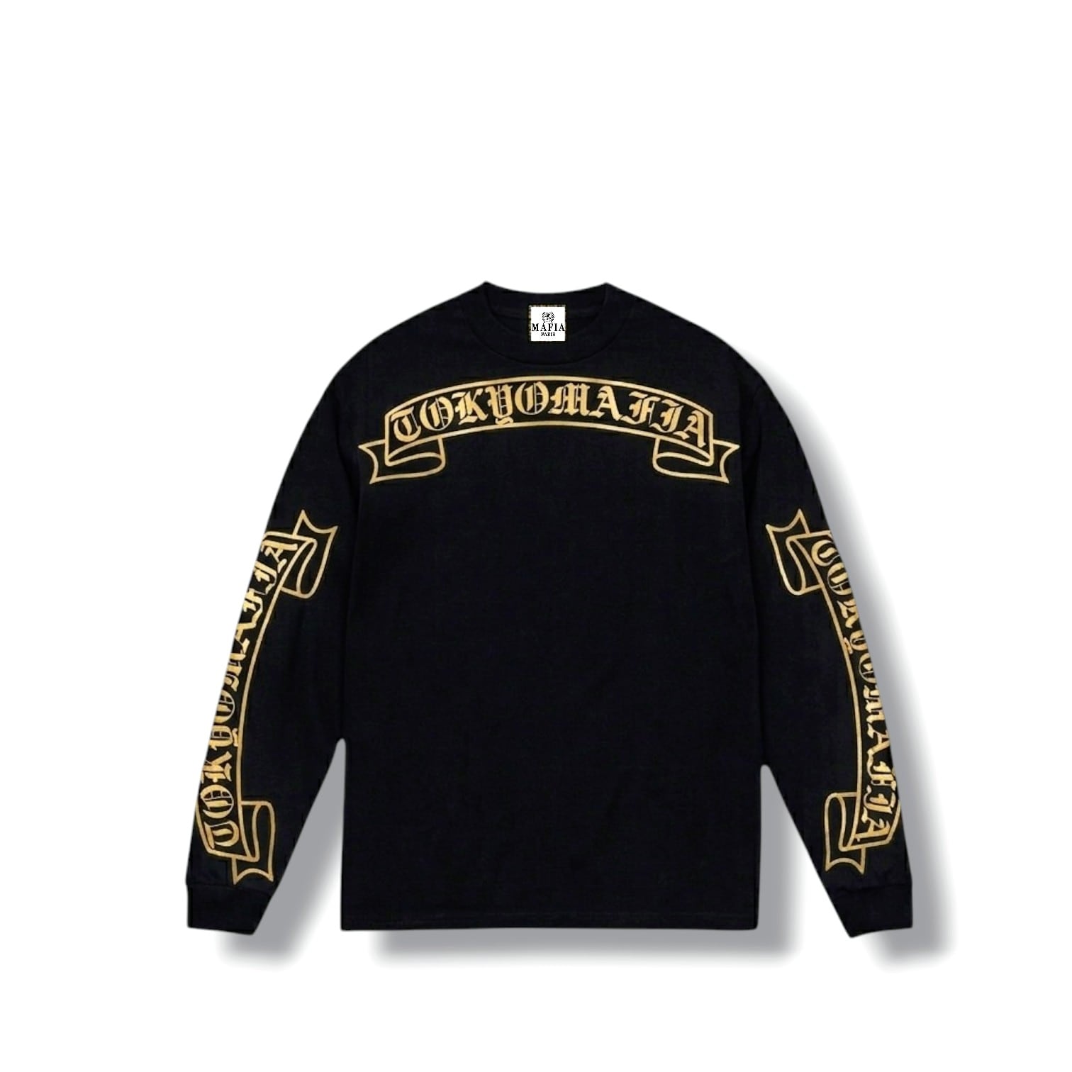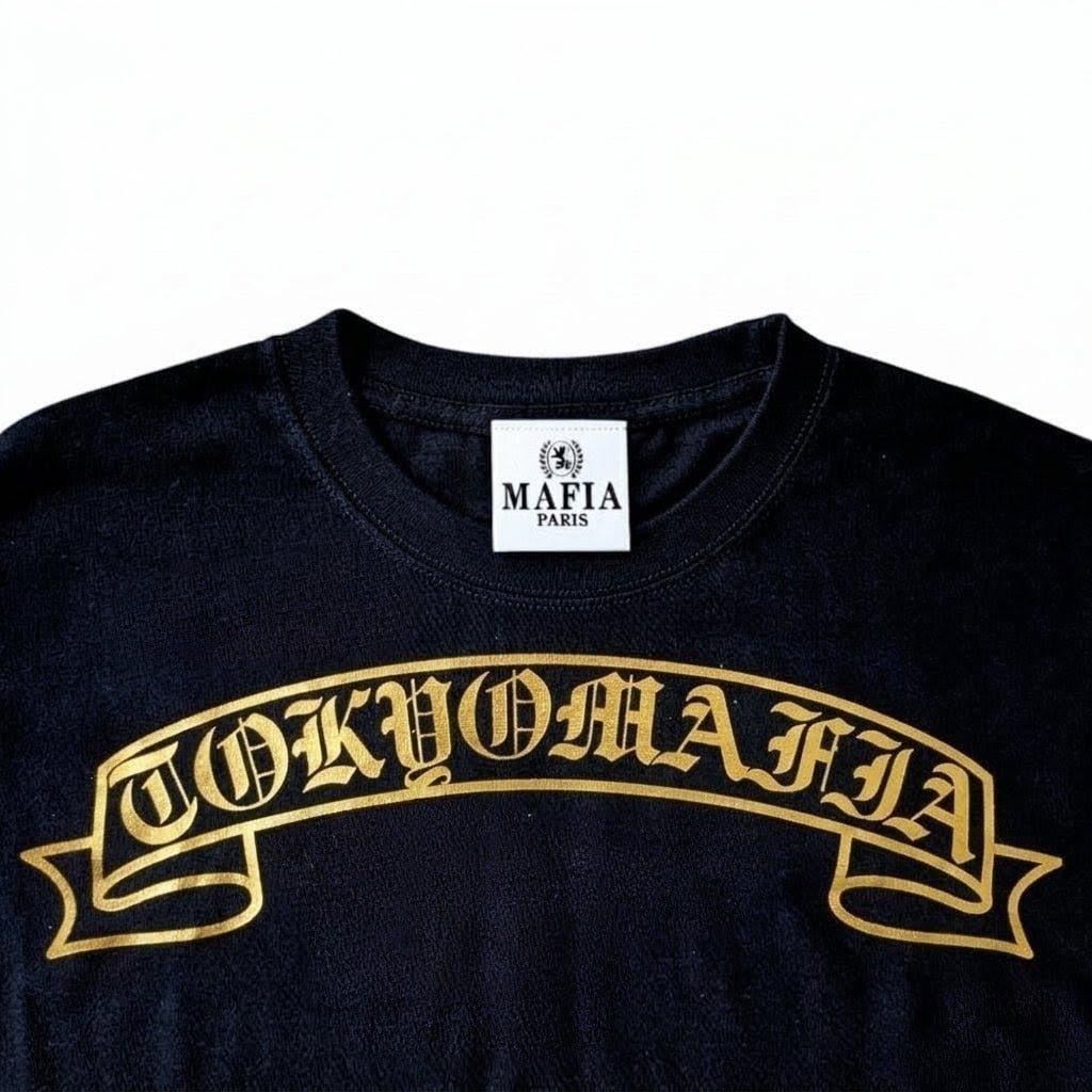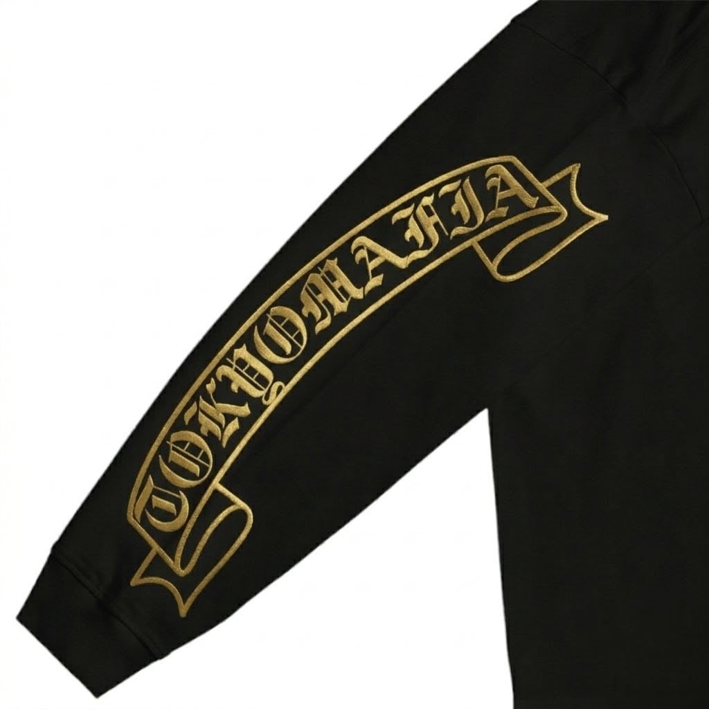 襟下フロント、バック中心、両袖フルサイズに堂々とプリントされた「TOKYOMAFIA」シグネイチャーは、街中でも一目で分かる存在感