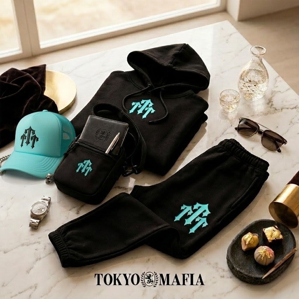 背面は贅沢に「TOKYOMAFIAシグネチャー」を施してエレガントな効果を演出し、柔らかな大きめフードにあしらいました。