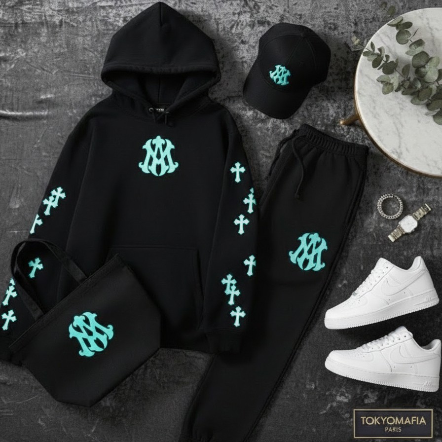 TOKYOMAFIAのインターロッキングMAロゴは、創業者がステンドグラスに描かれていた幾何学模様の交差する曲線からインスピレーションを得てデザインし、1999年に初めて発表された歴史的なロゴです