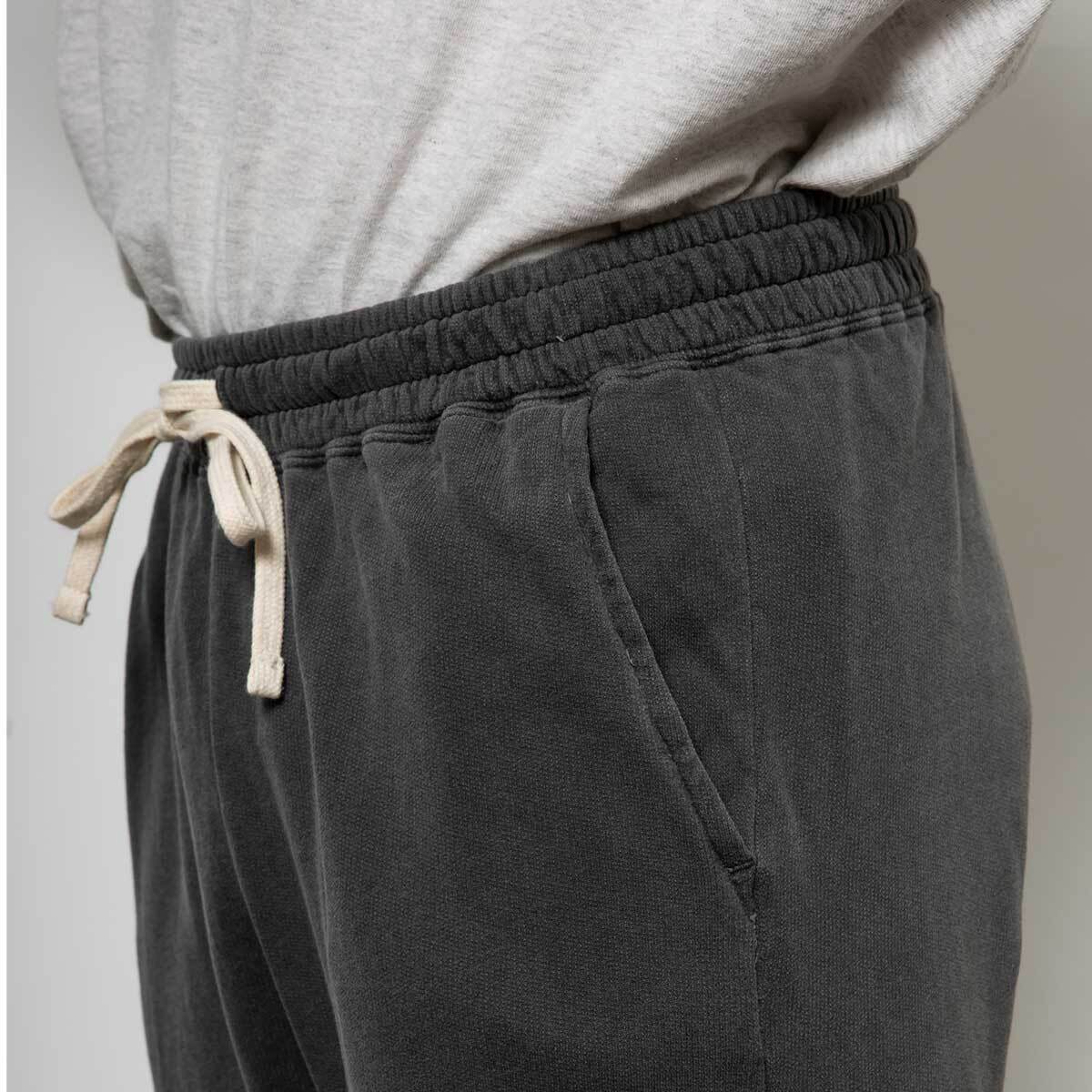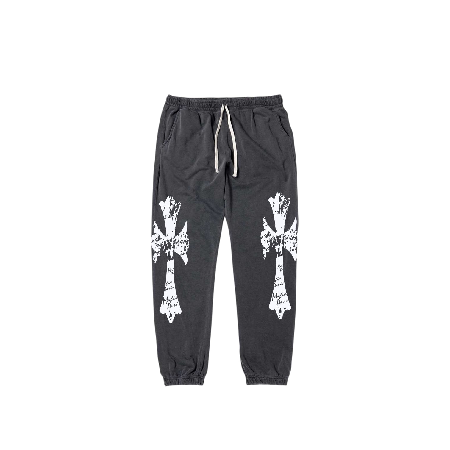 淡く色落ちしたブラックに、白いCROSS BONESがくっきり浮かぶスウェットパンツ
