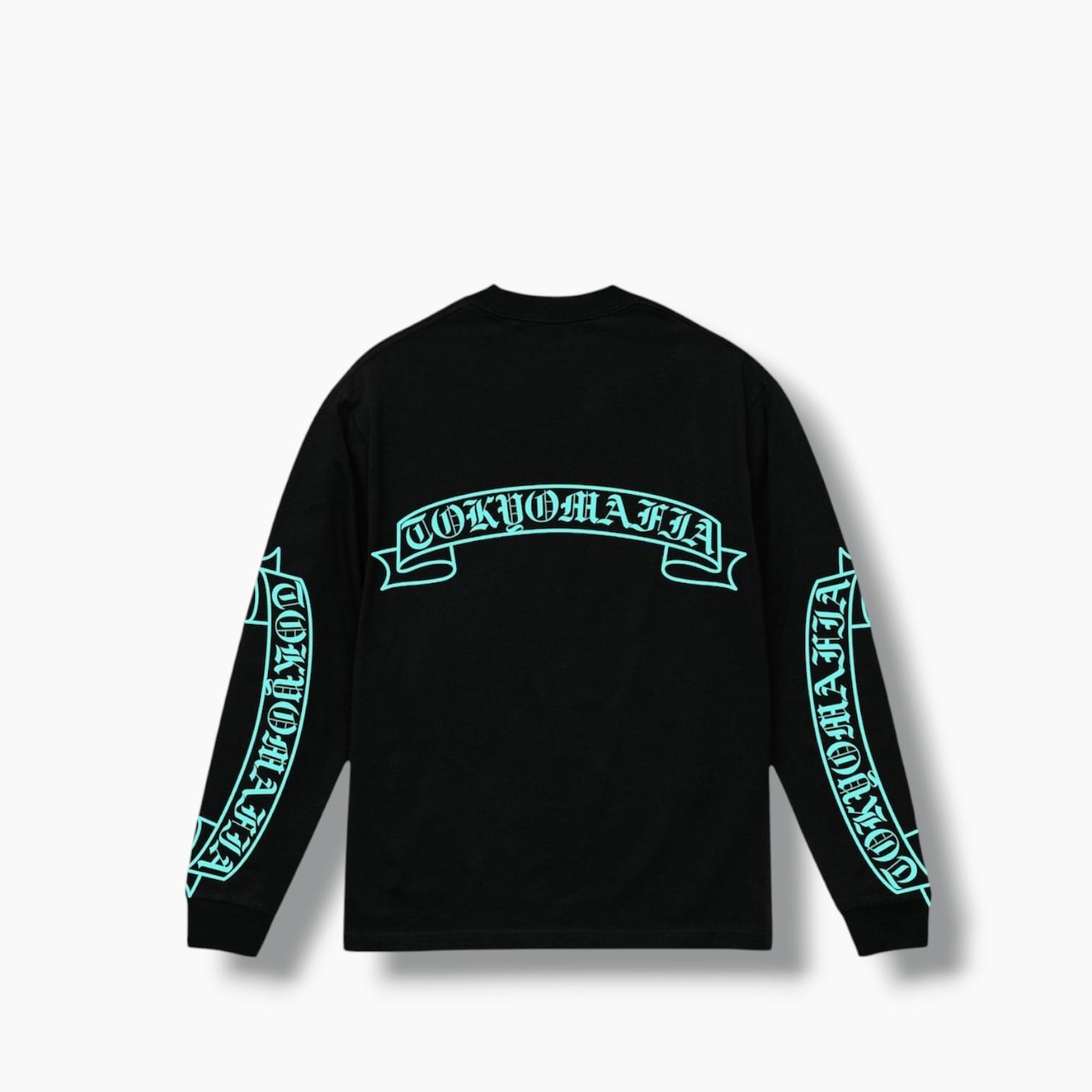 襟下フロント、バック中心、両袖フルサイズに贅沢に堂々とプリントされた「TOKYOMAFIA」シグネイチャーは、街中でも一目で分かる存在感