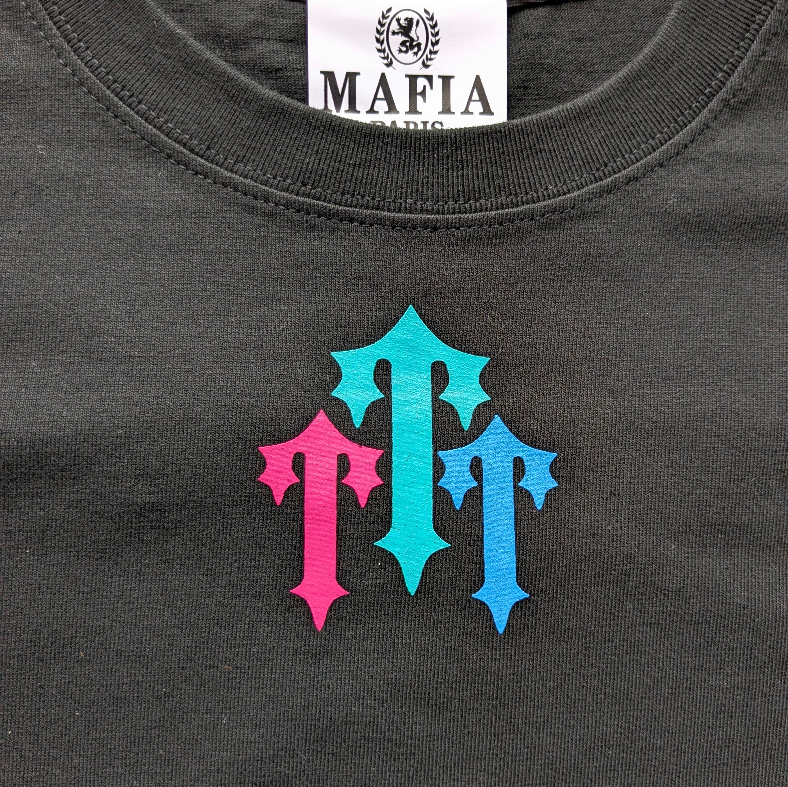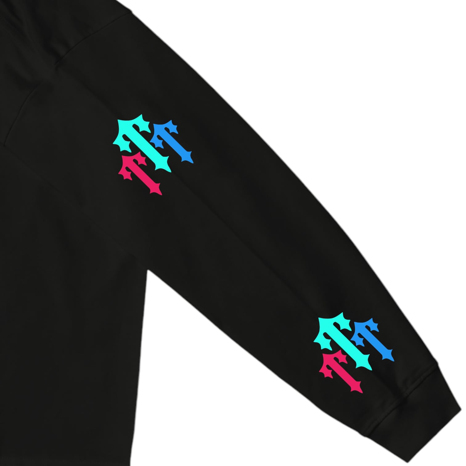 黒のボディに映えるラグジュアリーブルー×マイアミピンク×スカイブルーの輝きは、光を反射しながら静かに主張し、着るだけで視線を独占