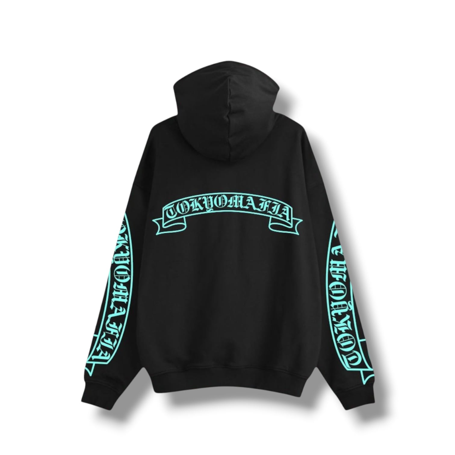 襟下フロント、バック中心、両袖フルサイズに贅沢に堂々とプリントされた「TOKYOMAFIA」シグネイチャーは、街中でも一目で分かる存在感